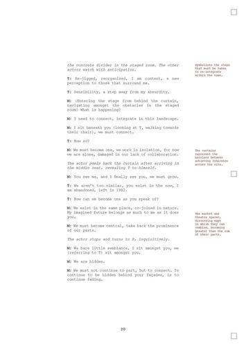 It conveys these emotions through the usage of personified monologues and a set of stage directions which highlight the spatial and emotional relationship between each actor, the wider site and the community.